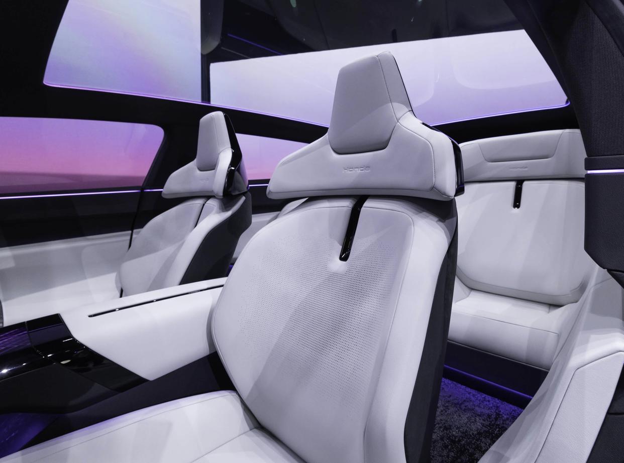 本田0 Saloon概念车内饰的设计十分新奇,采用了大面积黑灰色Alcantara面料和白色的麂皮绒材质的撞色搭配,带来了更加柔软、细腻的质感。环抱式的座舱还加入了黑色碳纤维饰板、黑色钢琴烤漆装饰面板以及随处可见的H发光车标,表明了它本田车的身份。车顶是一看巨大的全景天幕,配合着四周宽大的车窗,带来了充足的采光。中控台配备了贯穿式全液晶屏幕,整个屏幕的组成是:数字仪表盘+中央触摸屏+副驾乘显示屏+两侧的电子外后视镜显示屏幕组成。同时车辆的前端还配有一个长条样式的显示模块,用于显示其他基本车辆信息。新车的方向盘也采用了电控转向设计,完全没有物理连接,赛车异型方向盘也两侧的拨杆,也带来了全新的驾驶体验。配备了米白色的麂皮绒包裹的桶装赛车座椅,拥有更好的包裹性和支撑性。后排则是全包型座椅。